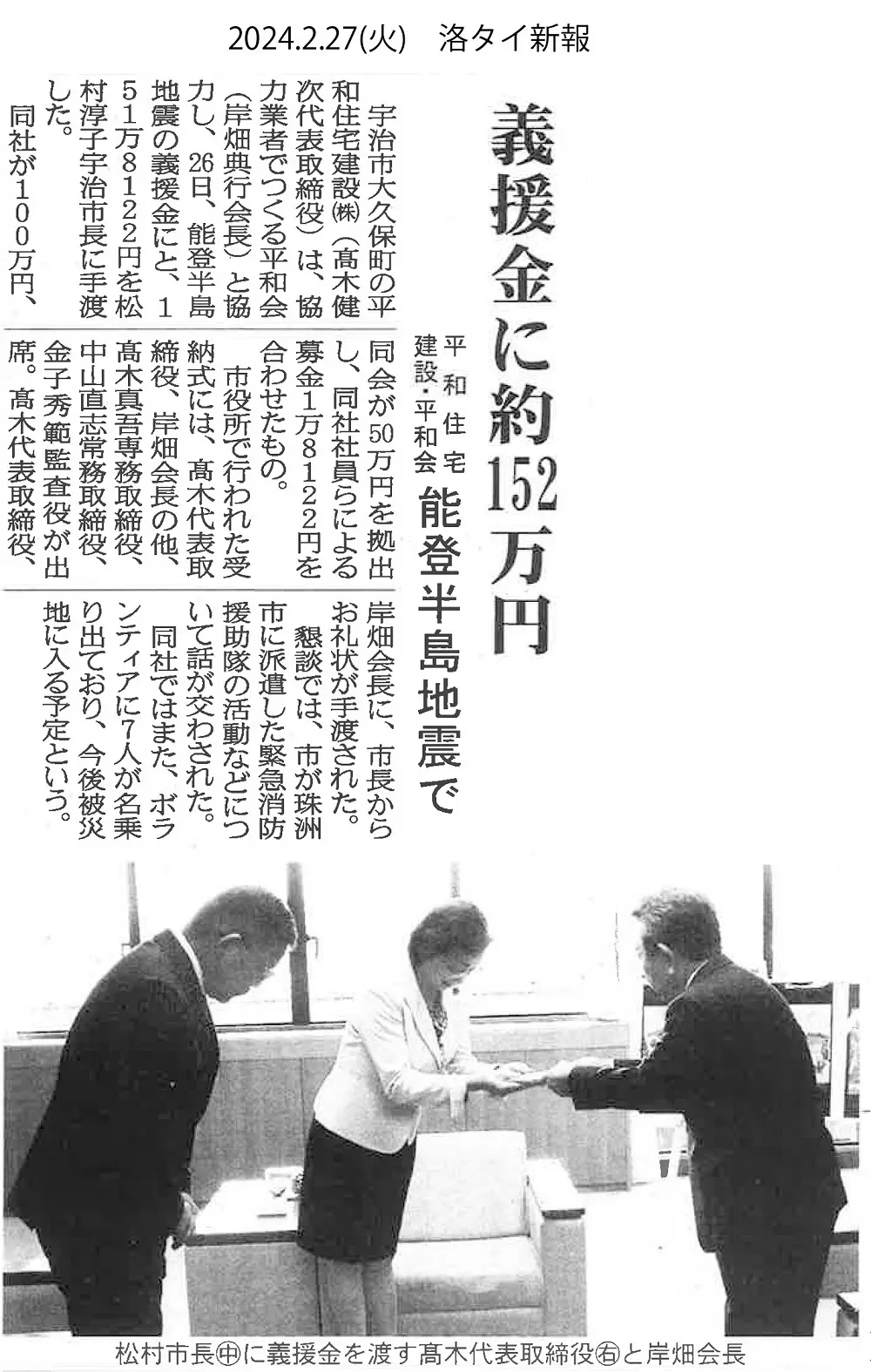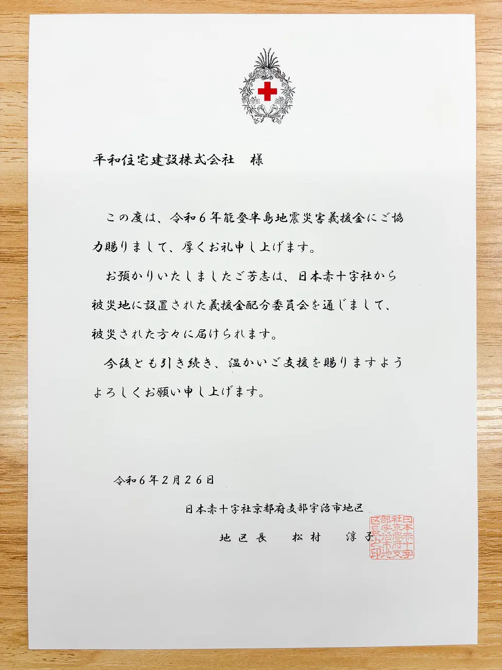 この度弊社では、協力業者で結成する「平和会」と共同で能登半島地震における義援金を寄付させていただきました。