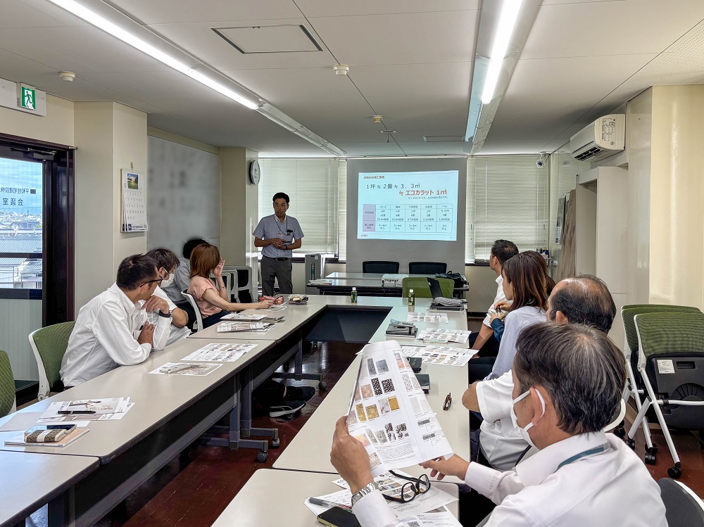 研修は弊社会議室にて、まずは座学を。エコカラットセルフの特徴、機能、最新情報など学びました。