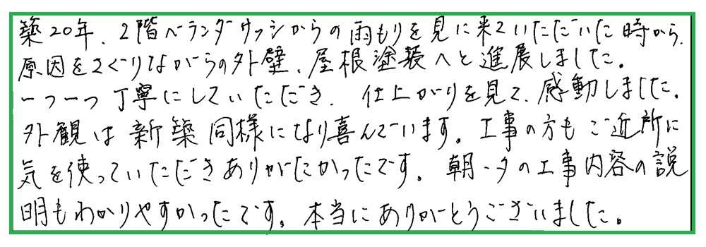 外観は新築同様になり喜んでいます。工事の方もご近所に気を使っていただきありがたかったです。朝・夕の工事内容の説明もわかりやすかったです。本当にありがとうございました。
