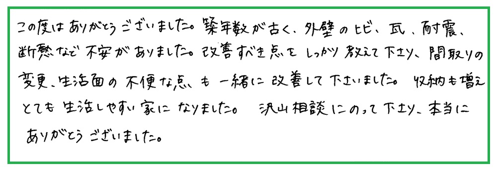 この度はありがとうございました。築年数が古く、外壁のヒビ、瓦、耐震、断熱など不安がありました。改善すべき点をしっかり教えて下さり、間取りの変更、生活面の不便な点も一緒に改善して下さいました。収納も増え、とても生活しやすい家になりました。沢山相談にのって下さり、本当にありがとうございました。