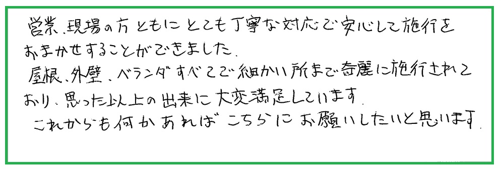 屋根、外壁、ベランダすべてで細かい所まで奇麗に施行されており、思った以上の出来に大変満足しています。