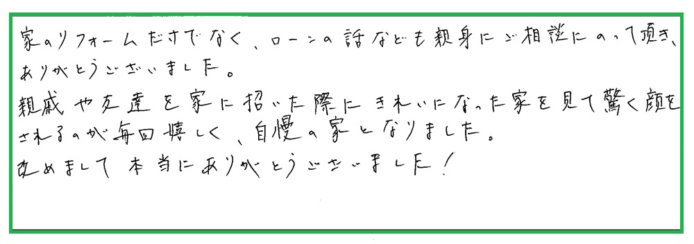 家のリフォームだけでなく、ローンの話なども親身にご相談にのって頂き、ありがとうございました。