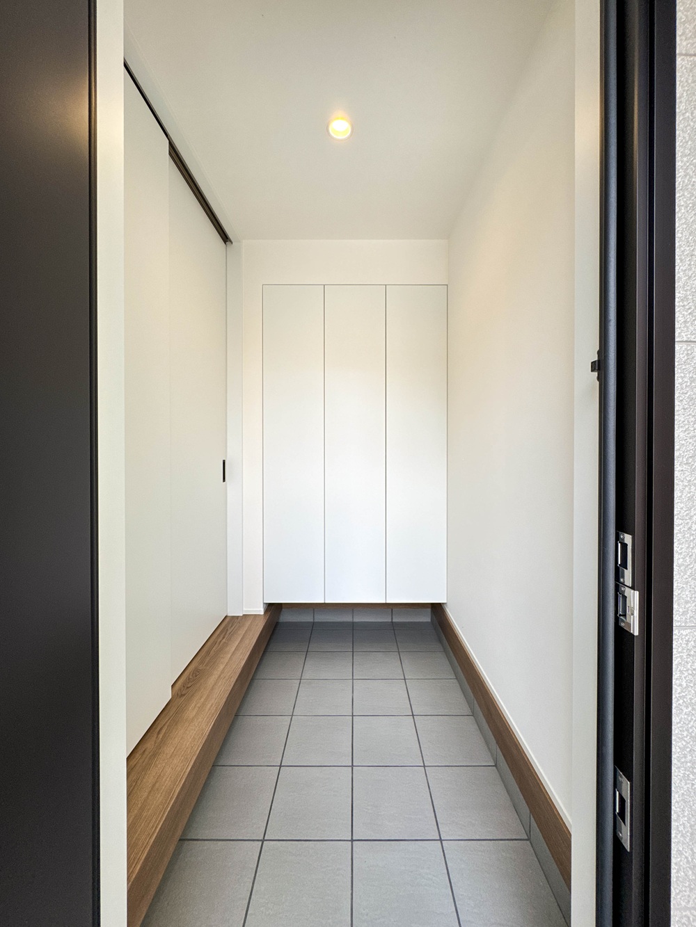 玄関収納は取っ手レス仕様で壁と一体化に見せることで、スッキリとした玄関にできます。