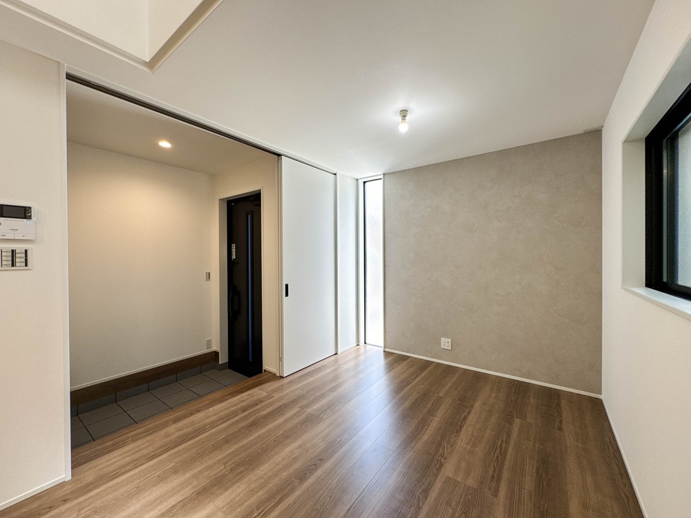 あえて玄関ホール(廊下)をなくし、玄関とLDKの仕切りはハイドアの引き込み戸にしました。引き込み戸は戸が壁の中に収納できるため、広々とオープンな空間となります。