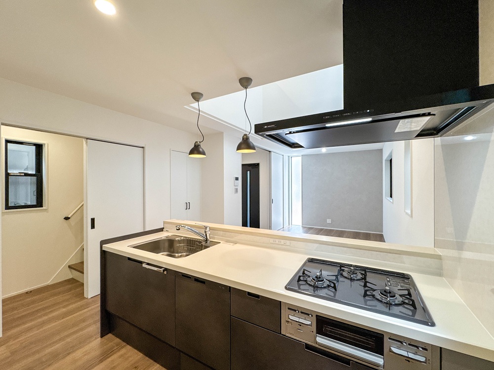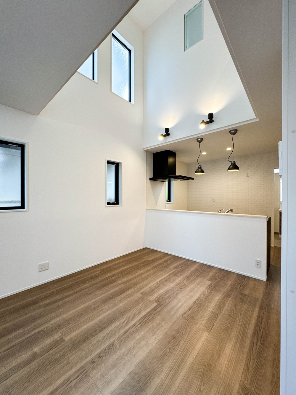 高窓から自然光をたっぷり採り入れた明るいLDKは、吹き抜けがもたらす縦の広がりで広く開放的に感じられます。