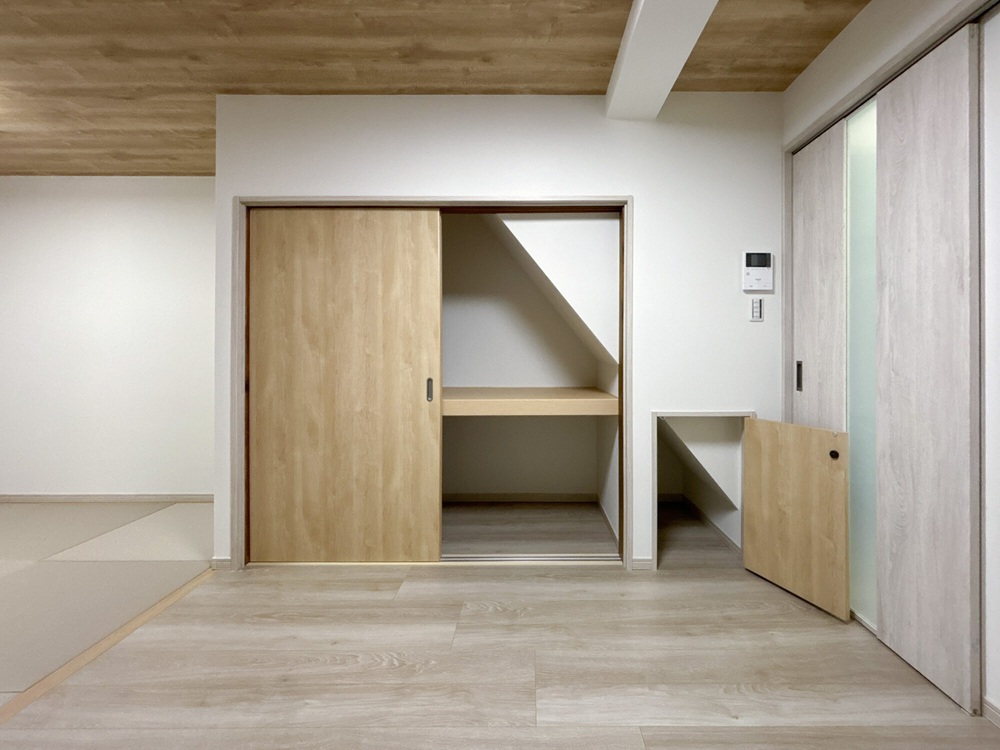 フローリングや建具に明るく柔らかな色をご提案。天井と床の木目方向を揃えることで広々と感じられるリビングになりました。リビング収納は階段下を活用しました。通常は壁になる1~2段目の階段下も造作扉をつけて収納スペースに。
