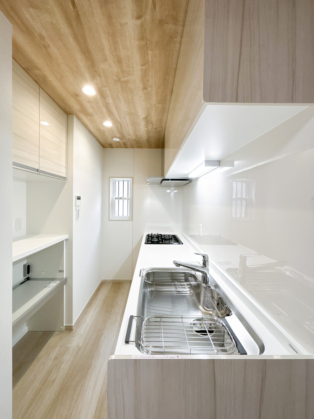 玄関の一部をキッチンに取り込み、収納スペースを確保しました。その広げたスペースにカップボードを造作。コンセントも使いやすいように配置し、カップボードにキッチン家電をまとめて置けるようになりました。キッチンはL型からI型へ変更し、お施主様ご希望のビルトイン食洗機も付けました。