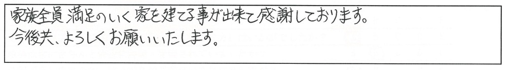 家族全員 満足のいく家を建てる事が出来て感謝しております。今後共、よろしくお願いいたします。
