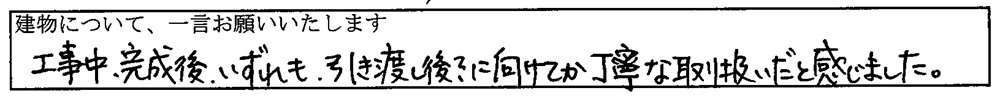 工事中、完成後、いずれも引き渡し後に向けて丁寧な取り扱いだと感じました。
