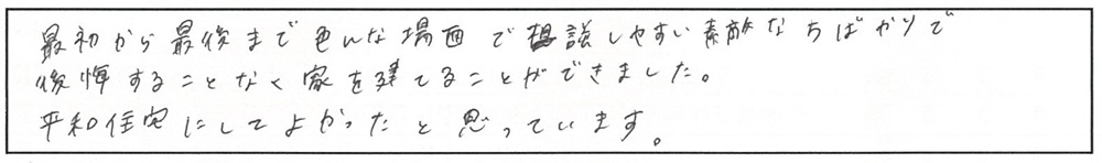 最初から最後まで色んな場面で相談しやすい素敵な方ばかりで、後悔することなく家を建てることができました。平和住宅にしてよかったと思っています。