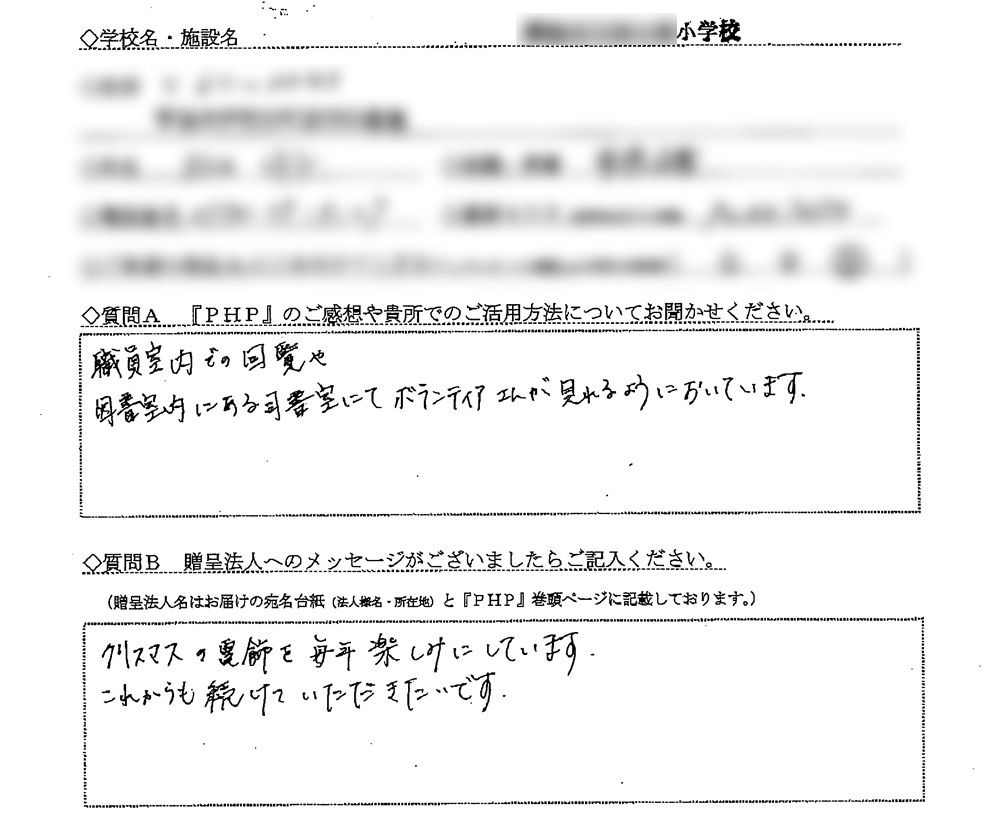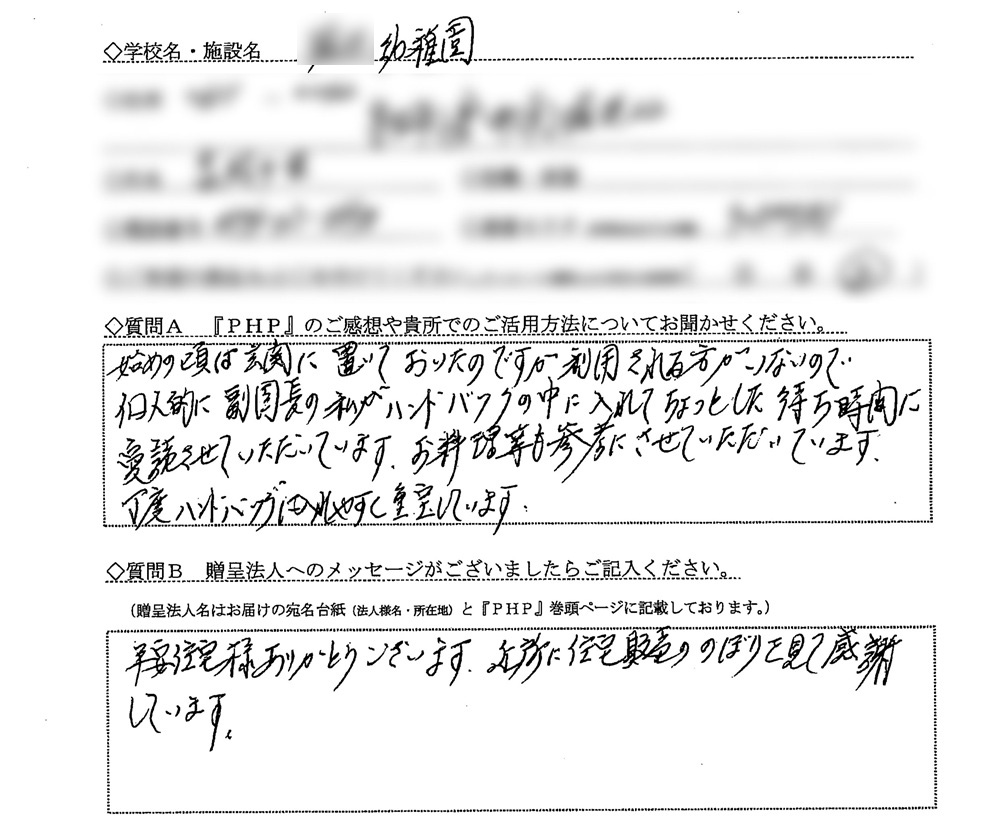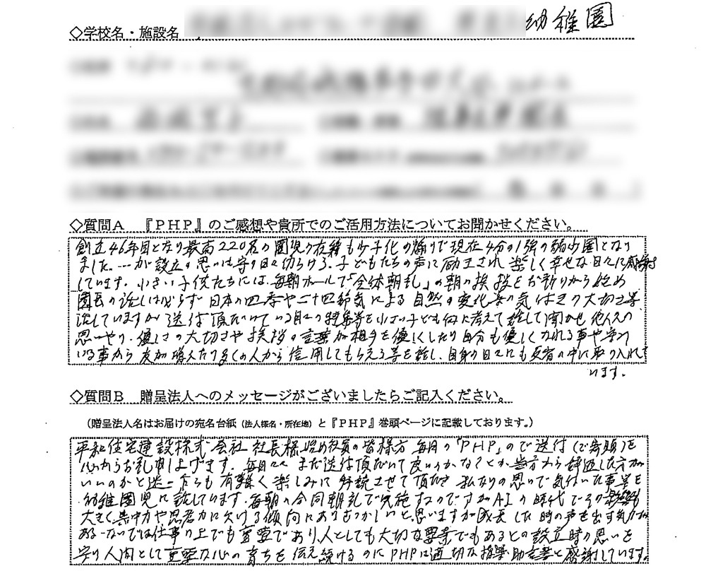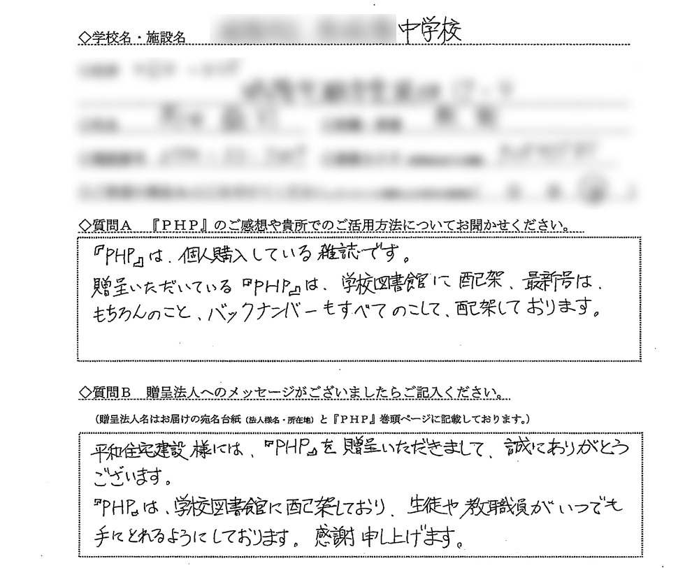弊社では地域貢献活動の一環として、PHP総研が刊行されている「月刊誌PHP」(100部)を、毎月、近隣の幼稚園・小学校・中学校・高等学校・専門学校などへ寄贈しております。