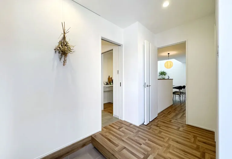 「整形で広いLDKにしたい」という点です。特殊な敷地形状の中で建物を四角形に、さらに最大限の面積を確保してもらい、希望通りのLDKになりました。玄関の限られたスペースも、扉の位置や開閉の向きなど細かいところまで考えて提案してくれたおかげで、ほんとうに暮らしやすい家になりました。