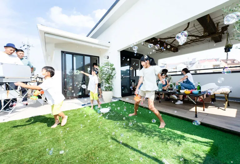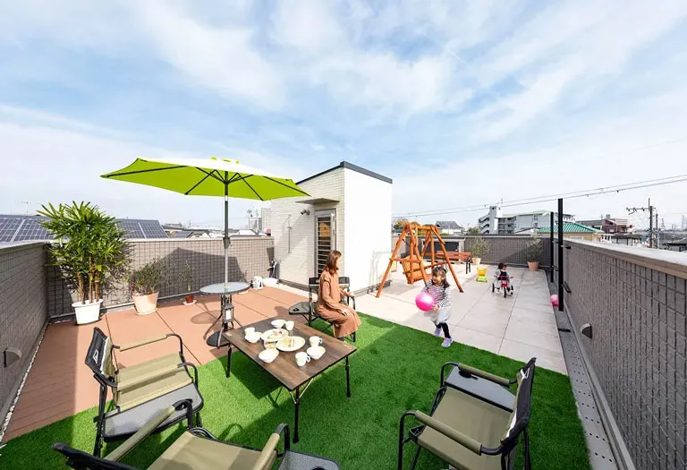 屋上が最高の遊び場になる!階段をあがると、そこに広がるのは空と気持ちいい風が吹き抜けるプライベートガーデン。ガーデニングやBBQなどおうち時間を楽しめるプライベートスペースです。平和住宅建設では家族や友人を招いての集いの場としてはもちろん、趣味や一人時間を楽しむマルチなスペースなど、ご家族にあった様々なスタイルをご提案しています。