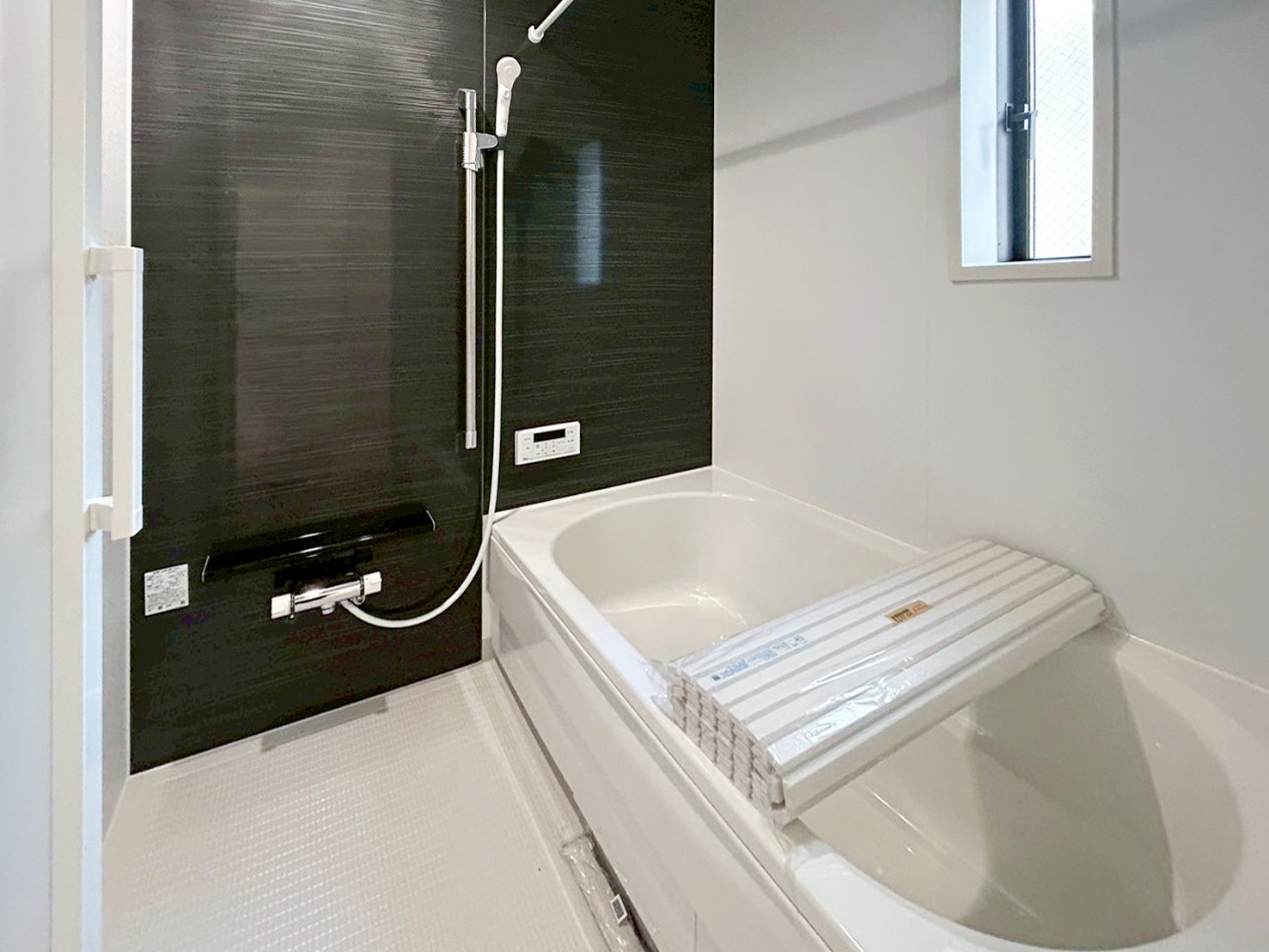 浴室換気暖房乾燥機付きの浴室は、お手入れがラクな仕様で、半身浴ができるステップ付きのバスタブ。